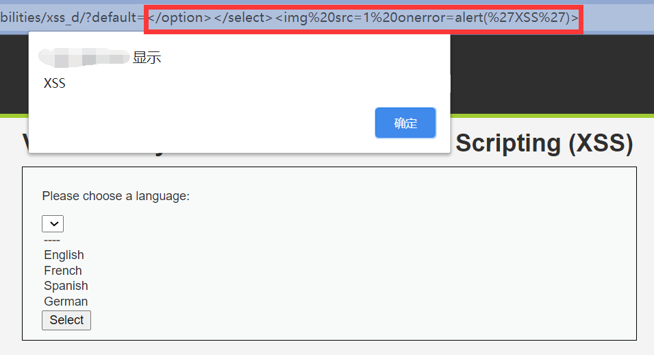 GET上传的default参数加入到<select>元素的选项卡中,每当页面被呈现时,恶意代码就可以运行。 - 后端没有做任何防护,意思就是随便注。
