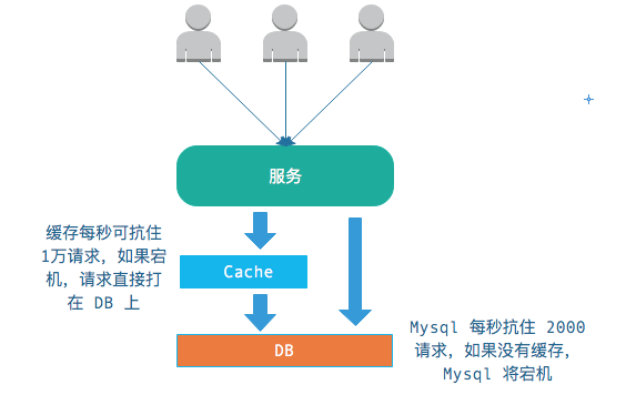 通常,我们会使用缓存用于缓冲对 DB 的冲击,如果缓存宕机,所有请求将直接打在 DB,造成 DB 宕机——从而导致整个系统宕机。