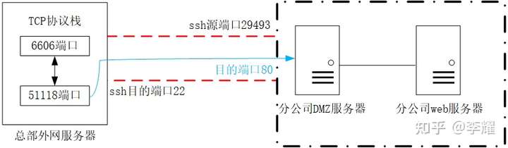 dmz发起ssh连接到总部服务器,并且远程端口转发。远程服务器访问转发端口时,数据将封装到回包通道,由于ssh本身加密,外部网络无法知晓网络交互逻辑,从而实现反向访问。