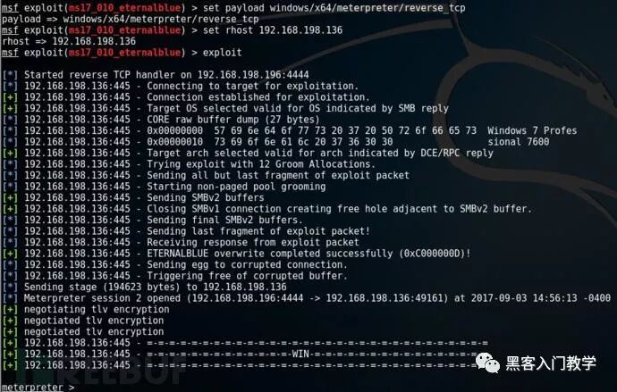 注意:运行了exploit命令之后,我们开启了一个reverseTCP处理器来监听192.168.198.196:4444,即我(攻击者)的本地主机地址(LHOST)和端口号(LPORT)。运行成功之后,我们将会看到命令提示符meterpreter >出现。