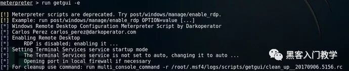 首先,我们需要确保目标Windows设备开启了远程桌面功能(需要开启多个服务),不过我们的getgui脚本可以帮我们搞定。我们可以使用-e参数确保目标设备开启了远程桌面功能(重启之后同样会自动开启):