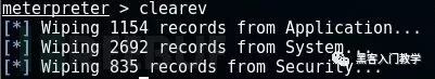 完成攻击操作之后,千万别忘了“打扫战场”。我们的所有操作都会被记录在目标系统的日志文件之中,因此我们需要在完成攻击之后使用命令“clearev”命令来清除事件日志: