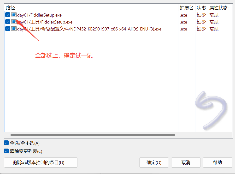 4. 为什么还原失败呢,我们发现还原的这三个文件的状态是缺少,说明在我们的svn中没有这三个文件,那么我们能不能让这三个文件出现在svn中,然后在对他进行还原呢?