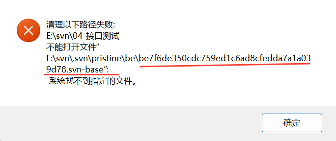 1. 在他的路径下随便创建三个文件,但是文件名要求一样,可以通过txt文件修改后缀名方式创建。然后我们在进行还原,然后发现,烦人的感叹号不见了,我们再进行清理,结果文件错误的信息没有了,但是系统在.svn\pristine\be目录下找不到指定的文件。