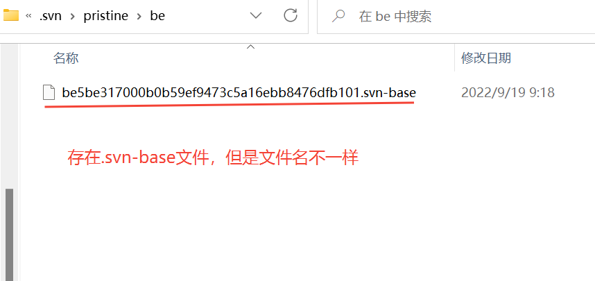 2. 我们去.svn\pristine\be目录下查看是否存在这个文件,在他的be目录下确实存在一个.svn-base文件,但是这两个文件名不一样
