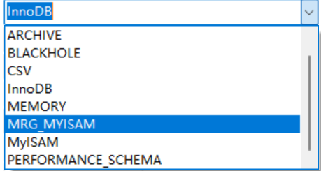 1. 在设计表→选项中可以看到MySQL的存储引擎有以下这些,但是常用的有InnoDB和MyISAM这两种