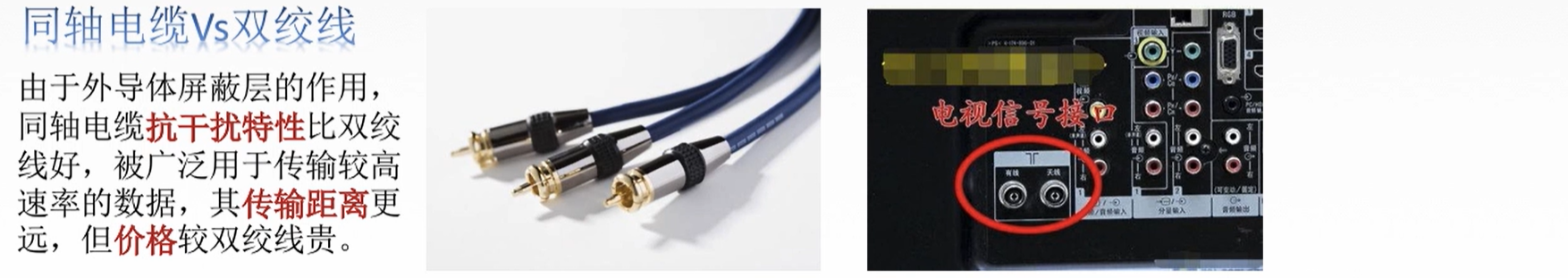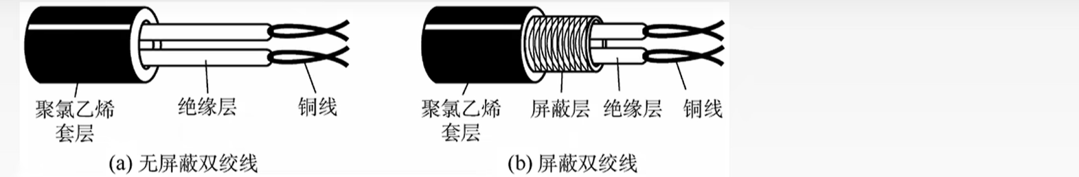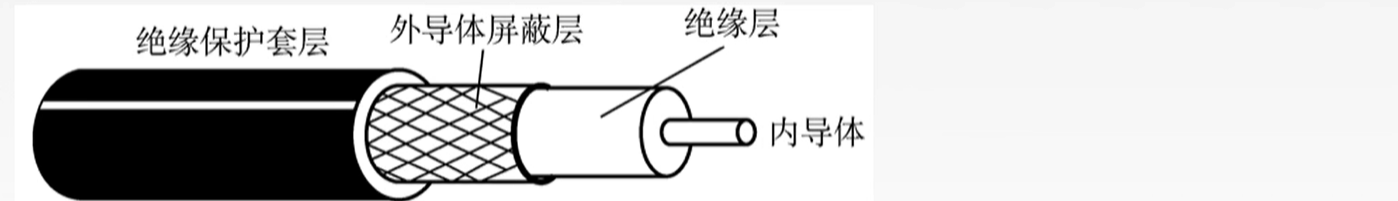 2. 同轴电缆:由导体铜制芯线、绝缘层、网状编织屏蔽层和塑料外层构成。