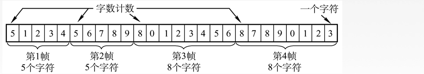 1. 字符计数法:帧首部使用一个计数字段来标明帧内字符数。缺点:一旦某个帧出错,后续的所有帧都会出错