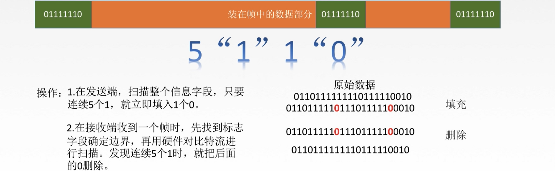 3. 零比特填充法:在发送端扫描整个信息字段,,只要连续5个1,就填充0