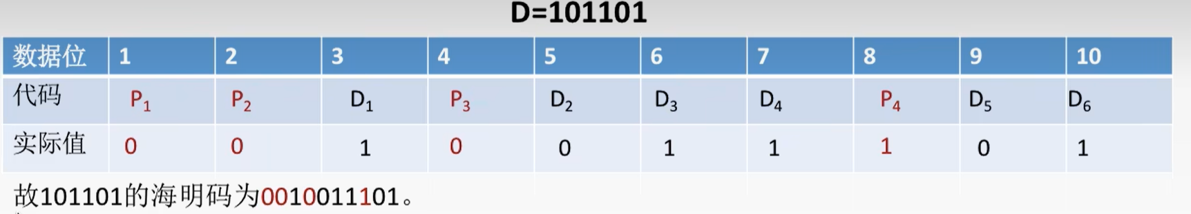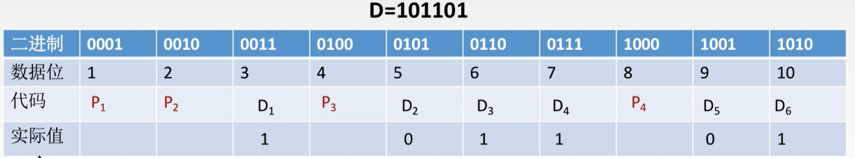 - P4的实际值:P4⊕D5⊕D6=0(二进制数第四位为1的数,第一行的共性为第四位为1)即P4+0+1=0,所以P4的实际值为1