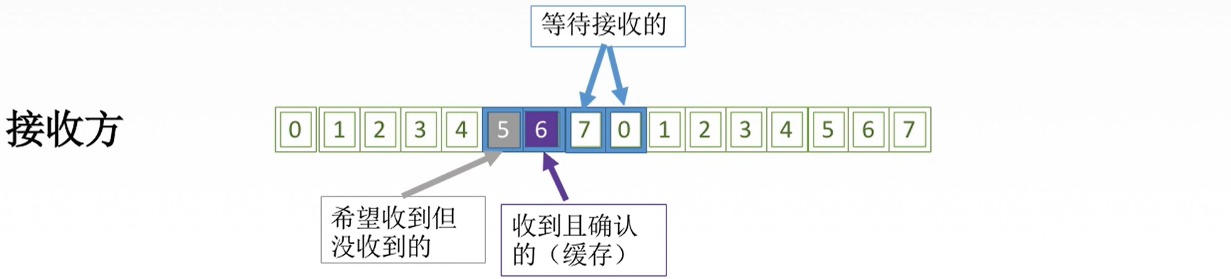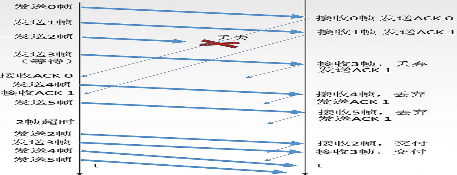 接收方会按照顺序接收发送方的数据帧,当接收到0号帧,就会等待接收1号帧,假如1号帧丢失,接收到了2号帧、3号帧等,则接收方会直接丢弃