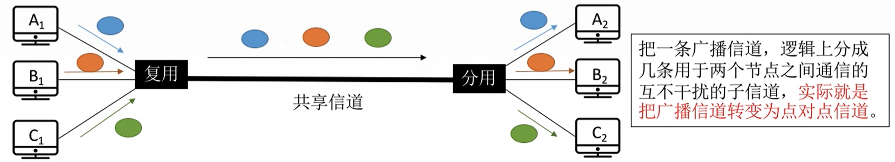 多路复用技术:吧多个信号组合在一条物理信道上进行传输,是的多个计算机或终端设备共享信道资源,提高信道利用率。