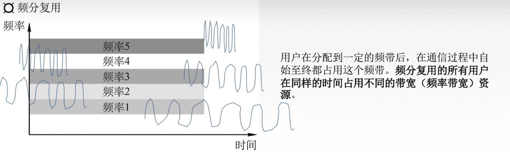 4. 宽带信号:将基带信号经过调制后形成的频分复用模拟信号,在传输到模拟信道上去传输(宽带传输)