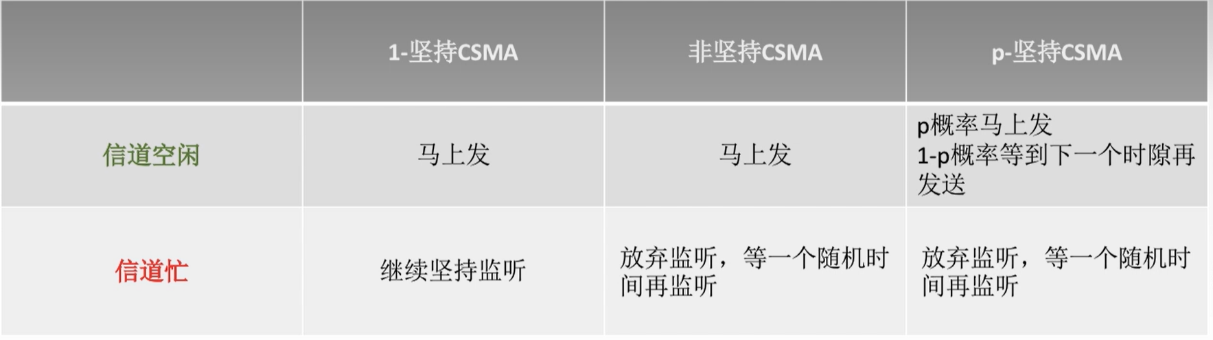 1. 1-坚持CSMA:如果主机要发送信息,先监听信道,信道空闲则直接传输,忙碌则一直等待,直到空闲立即发送