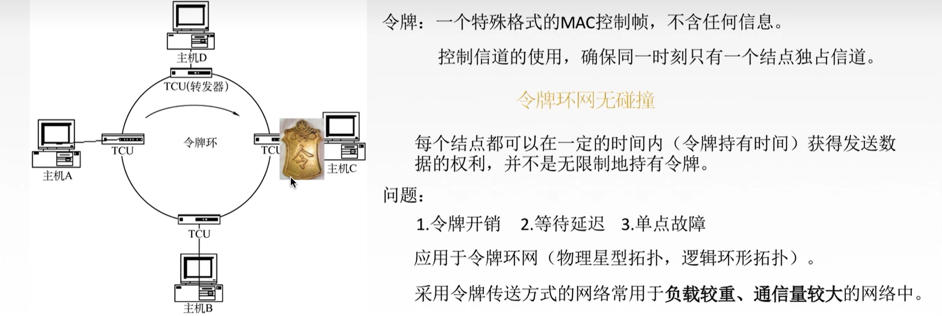 令牌:一个特殊的MAC控制帧,不含任何信息,控制信道的使用,确保同一时刻只有一个结点独占信道。