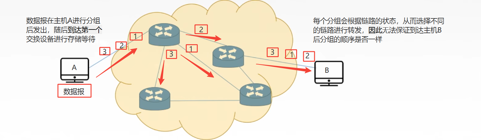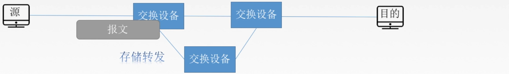 报文从源主机发送出去,到达交换设备后,会在交换设备进行缓存,等待链路处于空闲可用状态,再将报文发送到目的主机,链路的选择是动态