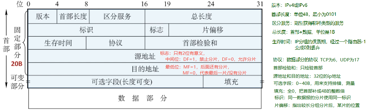 1. IP数据报分为首部和数据部分,首部分为固定部分(通常20字节)和可变部分