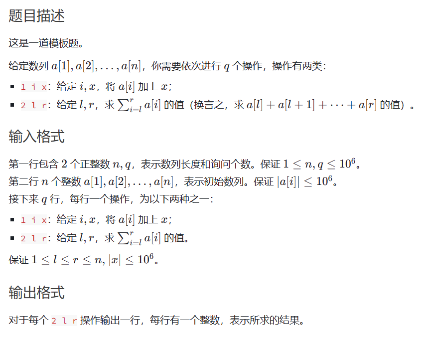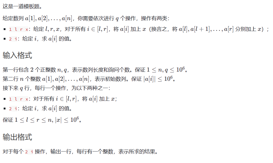 对于所有数据,$1≤n,q≤10^6 , ∣a[i]∣≤10^6 , 1≤l≤r≤n, ∣x∣≤10^6 $。