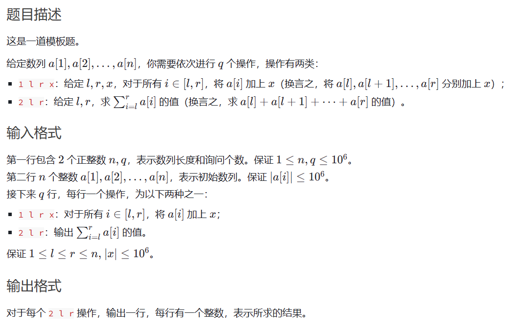 对于所有数据,\(1≤n,q≤10^6,∣a[i]∣≤10^6, 1≤l≤r≤n, ∣x∣≤10^6\)。