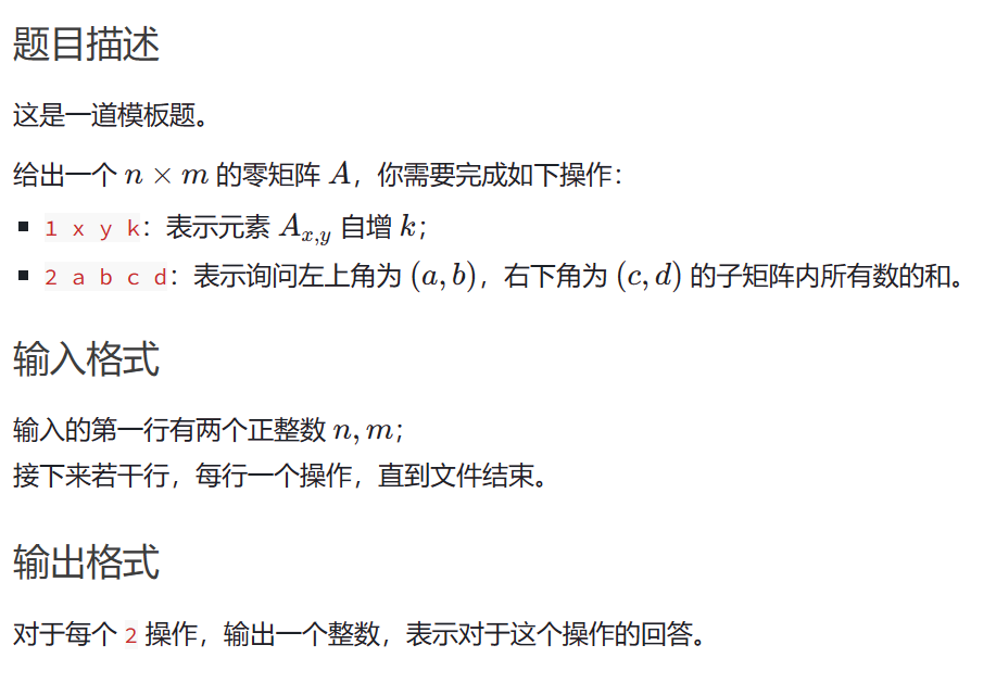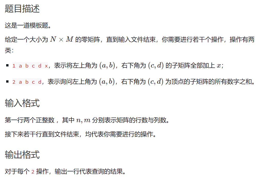 对于 100% 的数据,\(1≤n,m≤2048,∣x∣≤500\),操作不超过 \(2×10^5\)个,保证运算过程中及最终结果均不超过 64 位带符号整数类型的表示范围,并且修改与查询的子矩阵存在。
