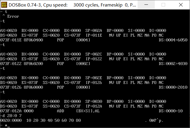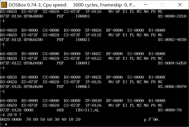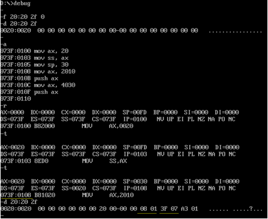 在debug环境中,按顺序录入以下内容,单步跟踪调试,观察寄存器和内存空间00200H~00207H,以