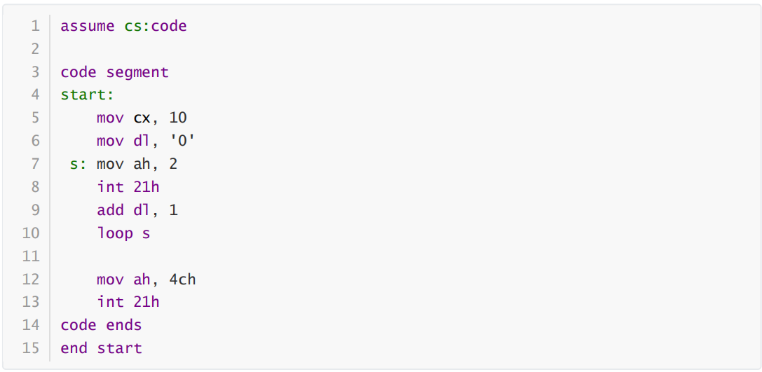 第二空:总的代码段为001CH字节,而mov ax, 4c00h命令占2H个字节 int 21h命令占3H个字节 ,所以line3-line12 代码段为0017H字节