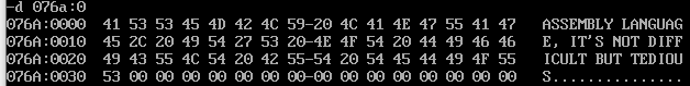 1 assume cs:code,ds:data 2 data segment 3 str db "assembly language, it's not difficult but tedious" 4 len equ $ - str 5 data ends