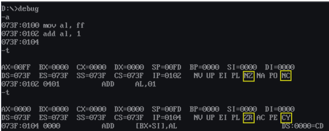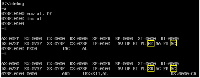 验证性实验:有些汇编指令会影响到标志寄存器中的一个或多个状态标志位。