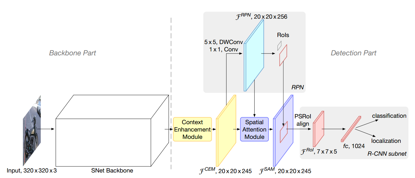ThunderNet的整体架构。ThunderNet的输入分辨率为320×320像素。SNet骨干网是基于ShuffleNetV2和专门为对象检测设计的。在检测部分,对RPN进行了压缩,R-CNN子网采用了1024-d的fc层,提高了效率。上 下文增强 模块利用来自多个范围的语义和上下文信息。空间注意模块通过引入RPN中的信息来细化特征分布。