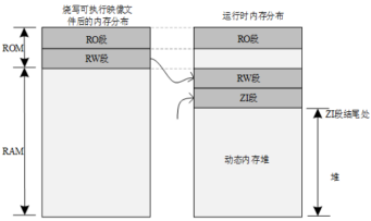 我们输入的代码,一般有代码部分和数据部分,这就是所谓的输入段,经过编译后就变成了bin文件中ro段和rw段,还有所谓的zi段,这就是输出段。对于加载域中的输出段,一般来说ro段后面紧跟着rw段,rw段后面紧跟着zi段。在运行域中这些输出段并不连续,但rw和zi一定是连着的。zi段和rw段中的数据其实可以是rw属性。
