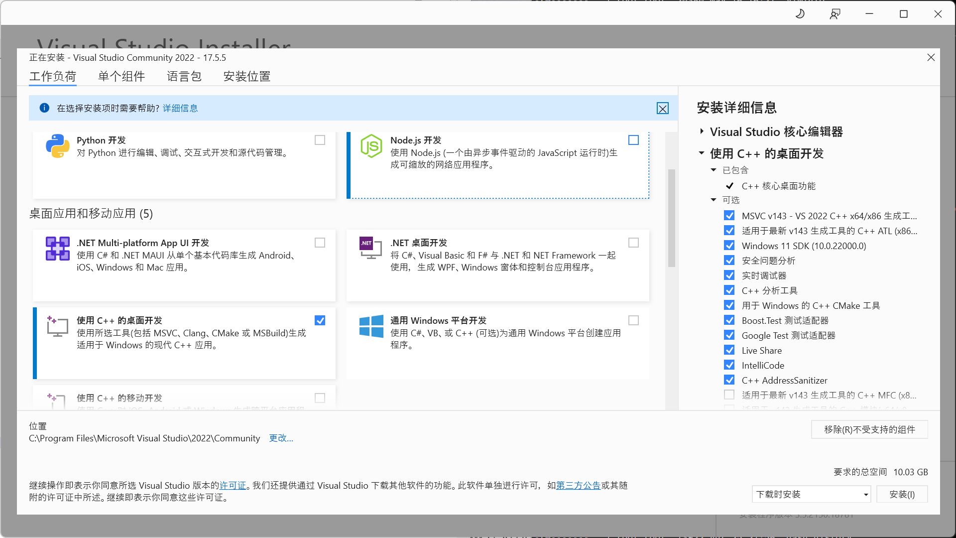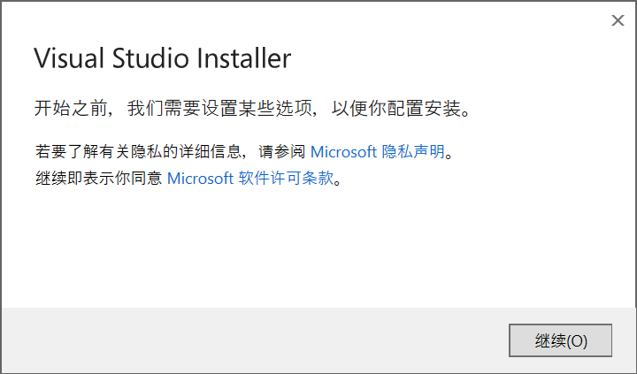 看个人使用情况选择对应的配置。我只是进行C和C++代码的开发,所以直接选择了“使用C++的桌面开发”。