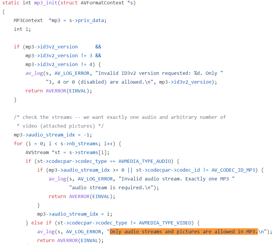 然后只能把这些提示一行行去搜,终于用Only audio streams and pictures are allowed in MP3.搜到一份源代码。
