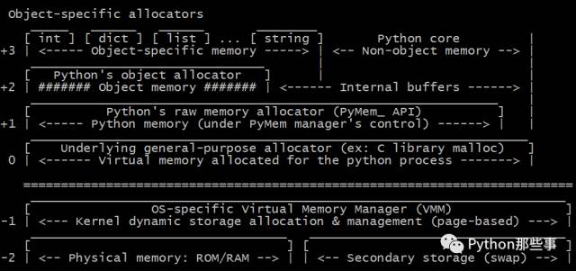 Python的内存管理是层次结构的,各层负责不同的功能,如下图所示:-1,-2层主要有操作系统进行操作,属于内核态;第0层是C中的malloc,free等内存分配和释放函数进行操作;第1层和第2层是内存池,有Python的接口函数PyMem_Malloc函数实现,当对象小于256K时由该层直接分配内存;第3层是最上层,也就是我们对Python对象的直接操作。感兴趣的同学可以阅读以下《Python源码剖析》,相信你的收获肯定是大大滴。