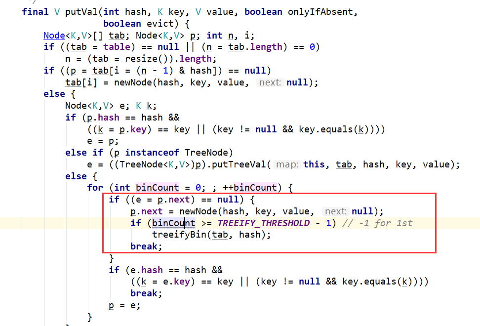 在添加键值对的时候会进行判断,是否达到链表转化红黑树的条件: