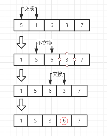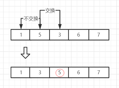 n个元素排序,相邻两个元素进行比较,按照需求,若两者比较大于0交换位置(升序),或者两者比较小于0交换位置(降序),每一轮比较排列好一个元素,排列好的元素下一轮不进行比较,共需要n-1次排序。