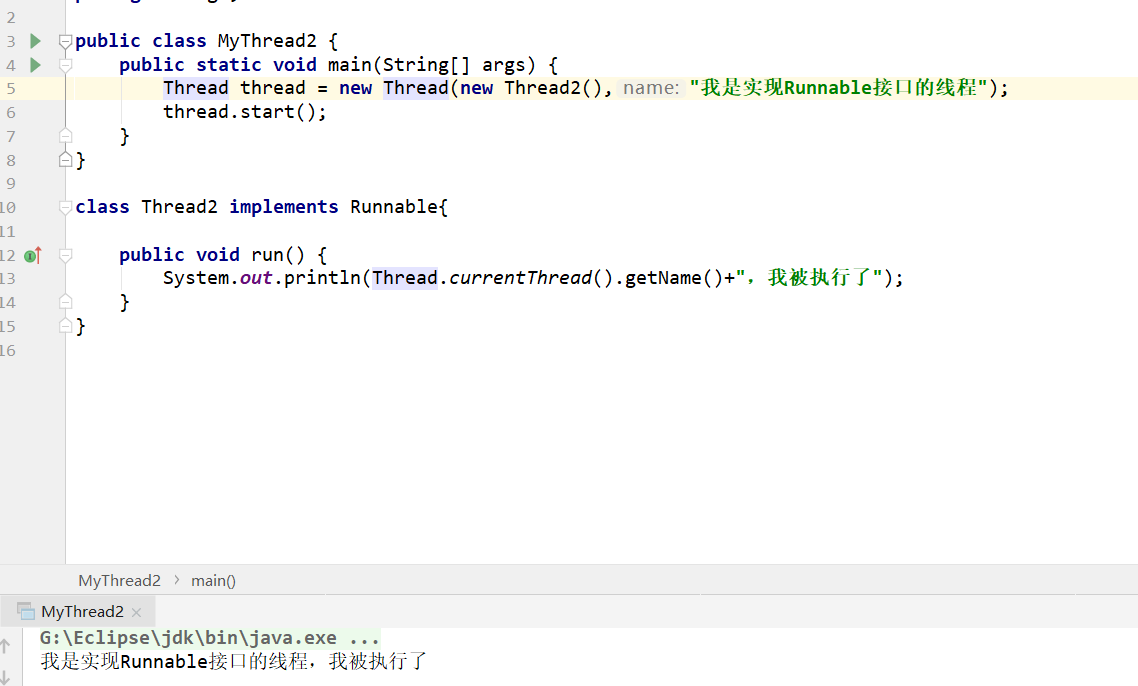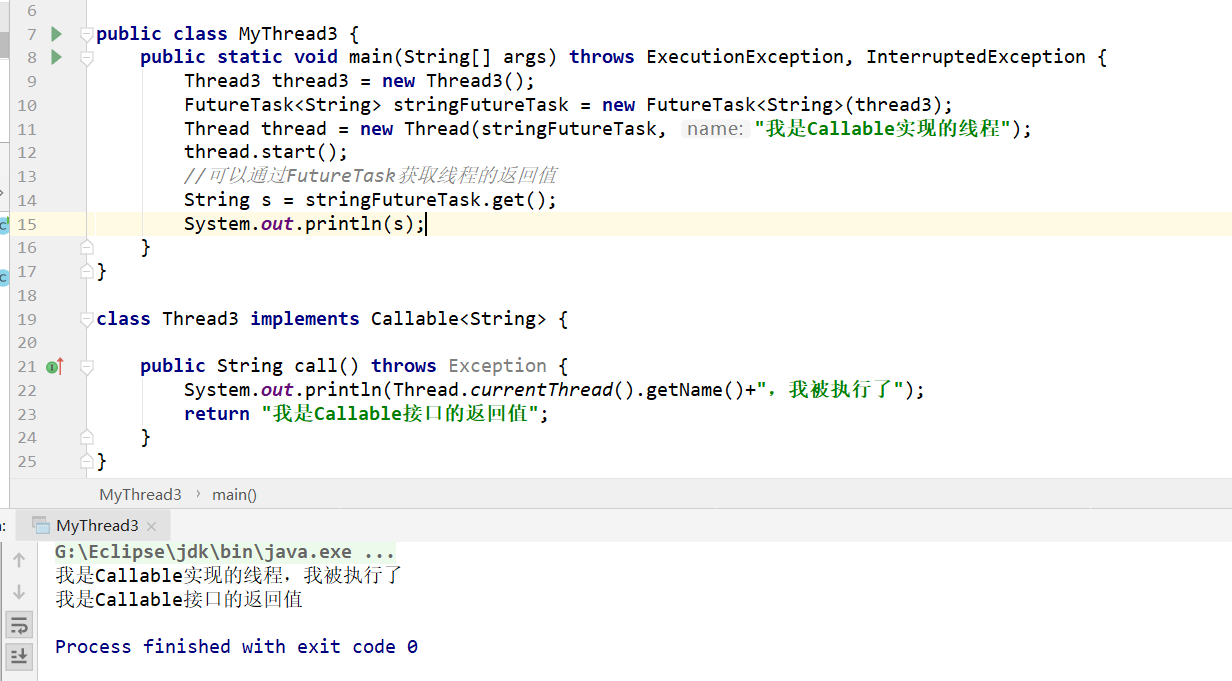 注意:因为要通过Thread对象来开启线程,上面给出了Thread类的构造方法,没有直接的方法可以传入Callable,所以我们要对其进行加功。而Callable又是特别的,它可以有返回值。所以提供了一个FutureTask类,通过它可以获取返回的结果。且它间接实现了Runnable接口,所以可以传入Thread的构造函数。如下: