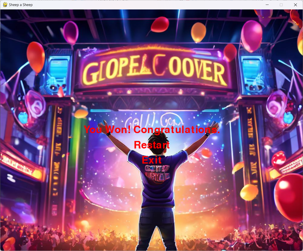 当玩家成功通过该游戏,游戏会显示获胜界面:界面显示"You Won! Congratulations."玩家可以选择点击"Restart"重新开始游戏,或者选择点击"Exit"退出游戏。