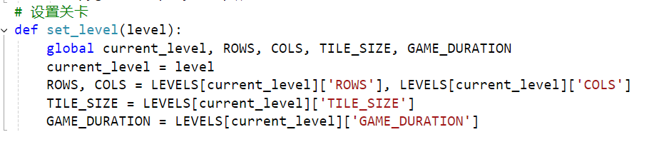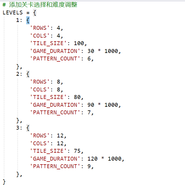 | 添加关卡选择和难度调整 | 通过LEVELS字典定义了不同关卡的设置,包括行数、列数、图案尺寸和游戏持续时间等。 | 完成 |