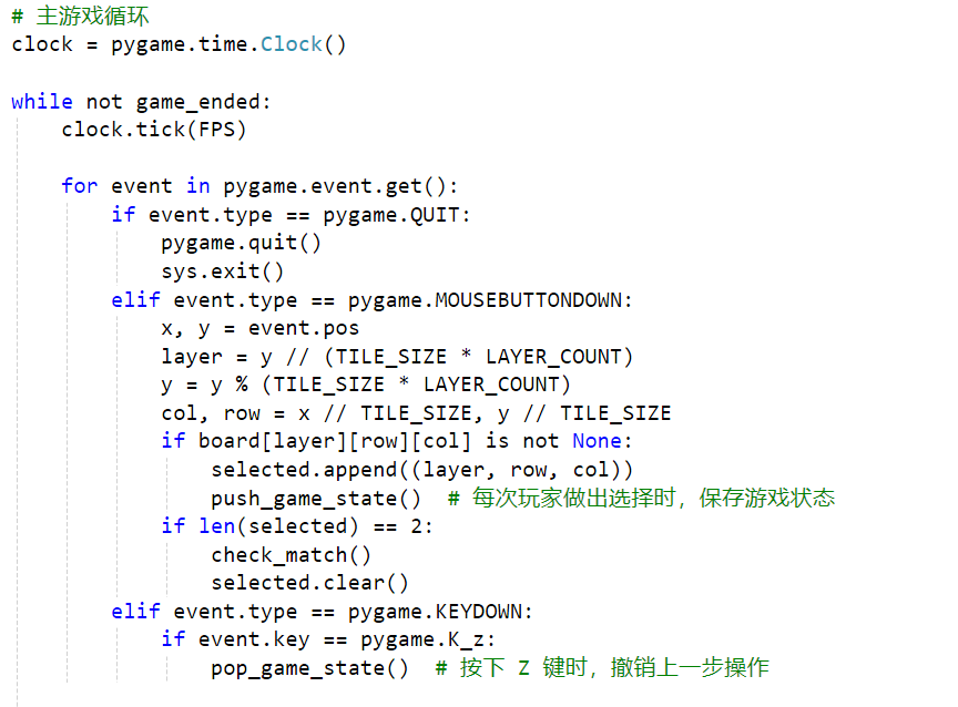 | 游戏状态的保存和恢复 | :通过游戏状态栈game_states,实现了撤销操作,即按下 Z 键时撤销上一步操作。 | 完成 |