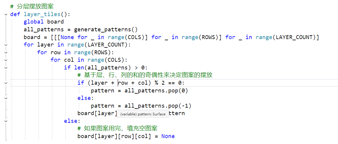 | 图案生成和分层摆放 | 通过generate_patterns函数生成图案,并在游戏重置时调用layer_tiles函数进行图案的分层摆放。 | 完成 |