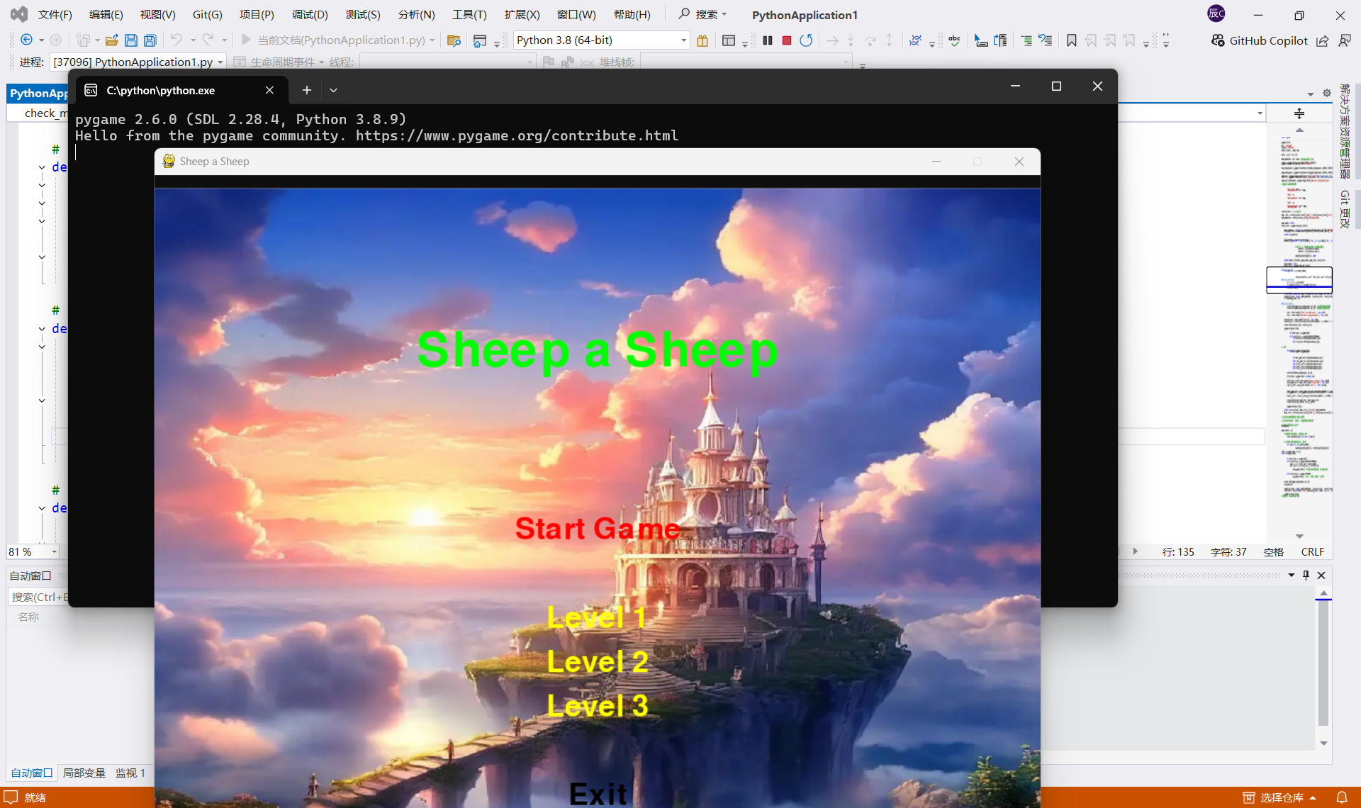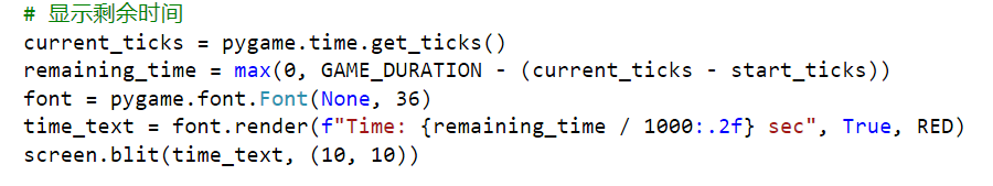 心得体会:把游戏的不同部分拆分成独立的函数,代码更易读,也便于调试和后续的更新。使用了文字和按钮的设计,这提升了游戏的视觉效果,同时也增加了用户友好性。在加载资源或执行关键操作时,加入适当的错误捕获机制,可以让程序在遇到问题时表现得更为稳定。确保所有加载的资源(图片和文字)都在不再需要时得到适当释放,以避免不必要的内存占用。