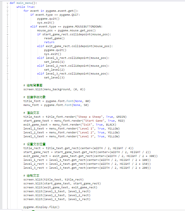 | 主界面设计 | 通过main_menu函数展示主菜单背景图,并实现了点击开始游戏、退出游戏以及选择不同关卡的功能。 | 完成 |