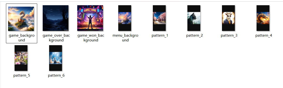 通过使用AIGC工具生成了六张游戏 UI图案、游戏主菜单背景图片、游戏背景图片以及游戏结束背景图片。