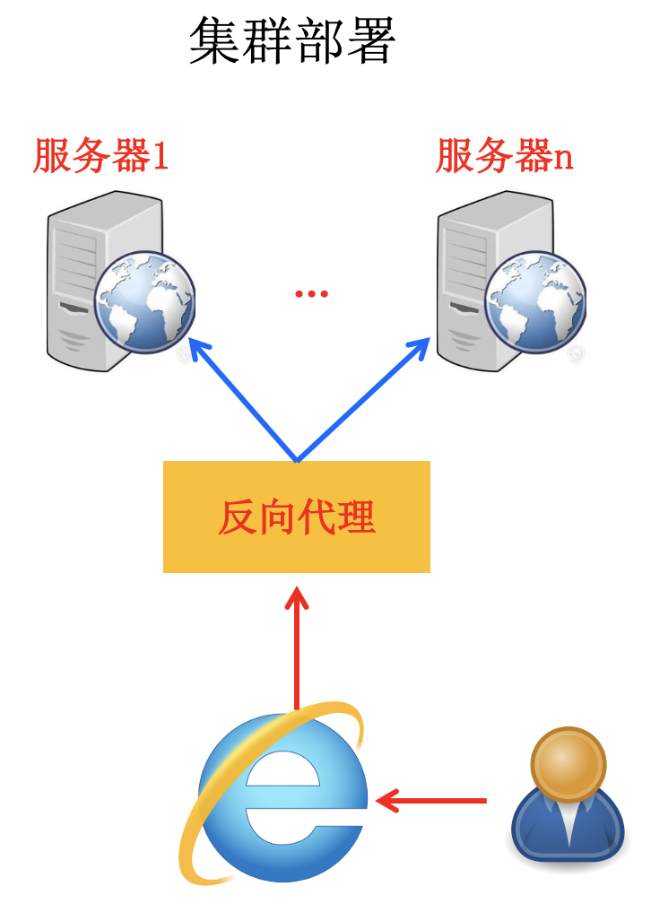 简单说一下上面的架构,有一个关键点是反向代理,简单理解反向代理,就是为集群找个代理,接收用户请求,再分发给集群中的服务器。