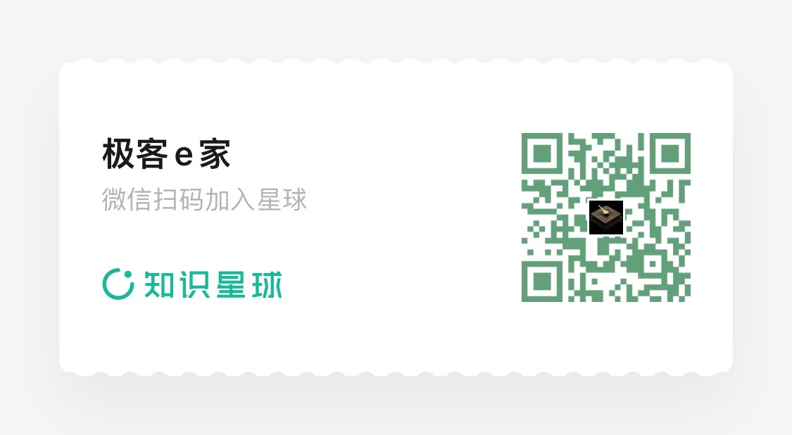最后,欢迎扫码加入星球《极客e家》,星球里,大咖云集,我们将一起打造极客文化。在这里,您将体会到:
