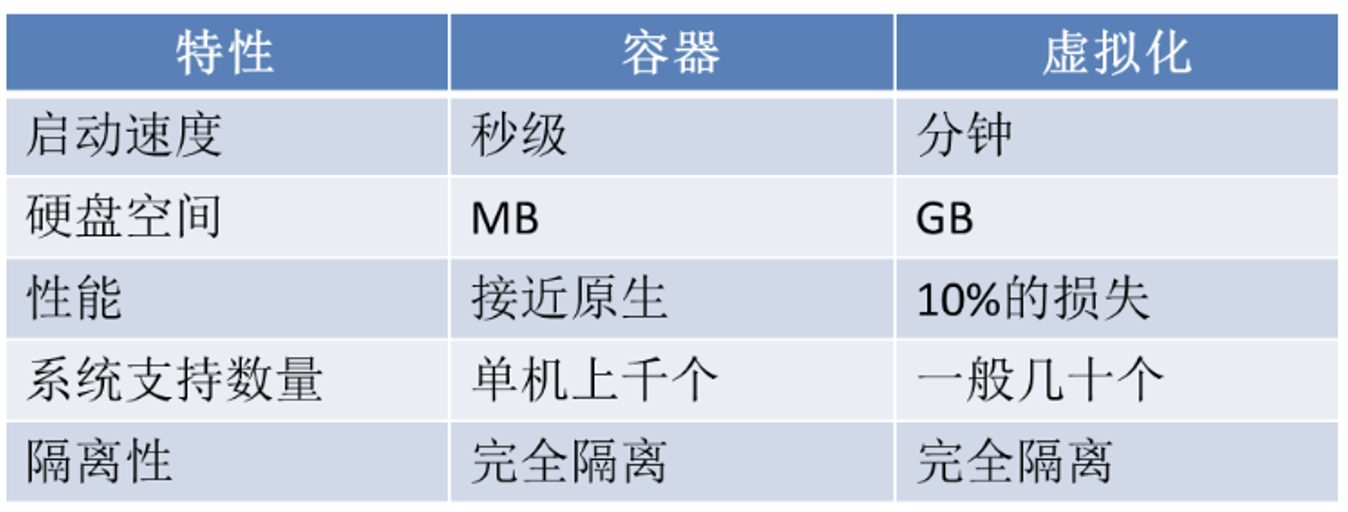 虚拟化:所有VM拥有自己的操作系统,通过虚拟层操作硬件,占用许多应用本身不需要的资源,一个虚拟机可能至少也要几百兆内存,启动也会很慢。