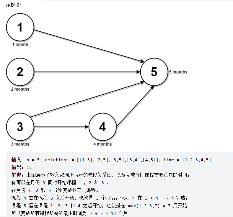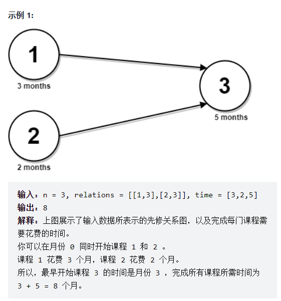 给你一个整数n,表示有n节课,课程编号从1到n。同时给你一个二维整数数组 relations ,其中 relations[j] = [prevCoursej, nextCoursej] ,表示课程 prevCoursej 必须在课程 nextCoursej 之前完成(先修课的关系)。同时给你一个下标从 0 开始的整数数组 time ,其中 time[i] 表示完成第 (i+1) 门课程需要花费的月份数。