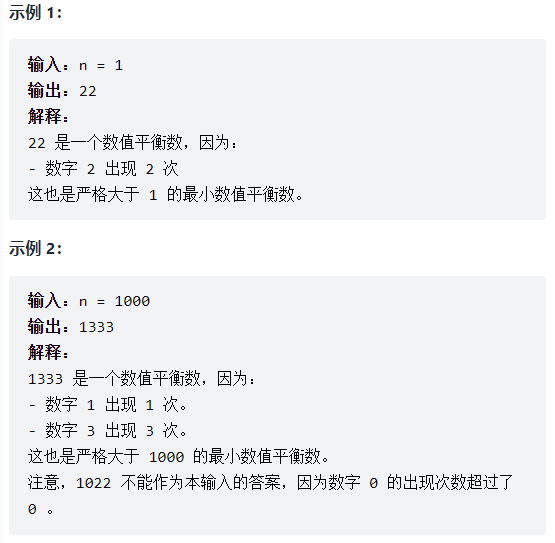 给你一个整数n,请你返回严格大于n的最小数值平衡数。